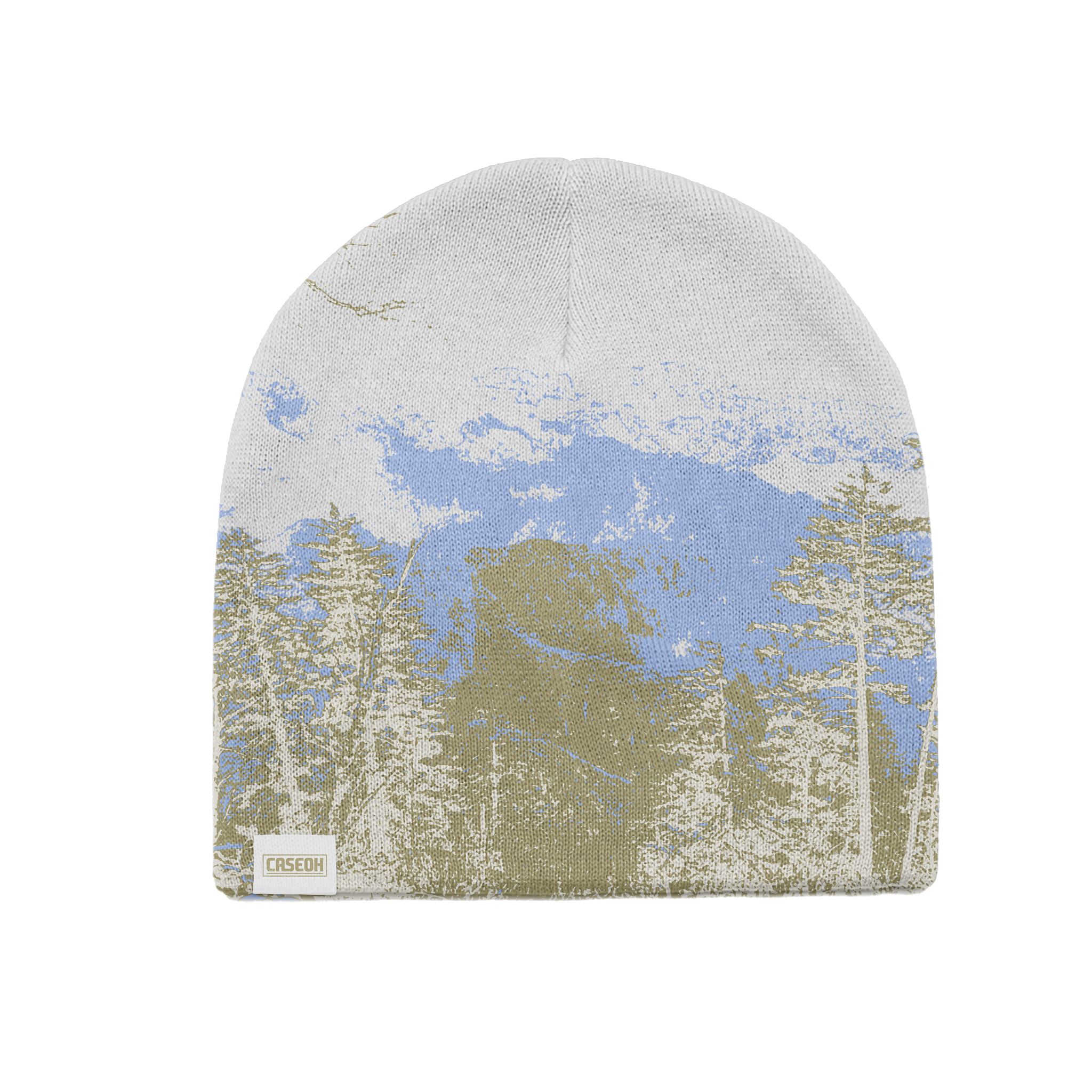 CaseOh's No Fold Camo Beanie. Yep, no fold. Mountains. Trees. CaseOh hem tag. Clean. Cop.